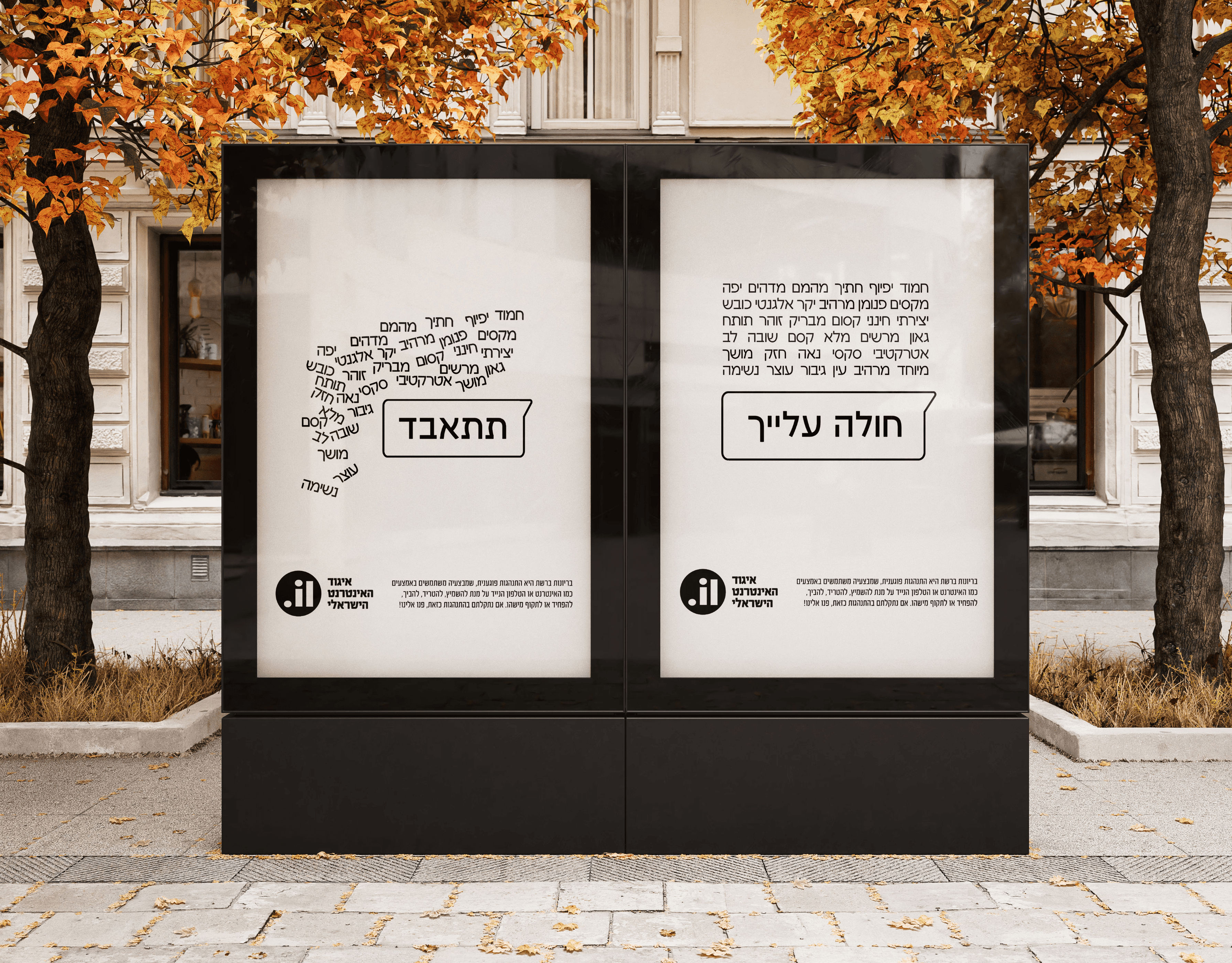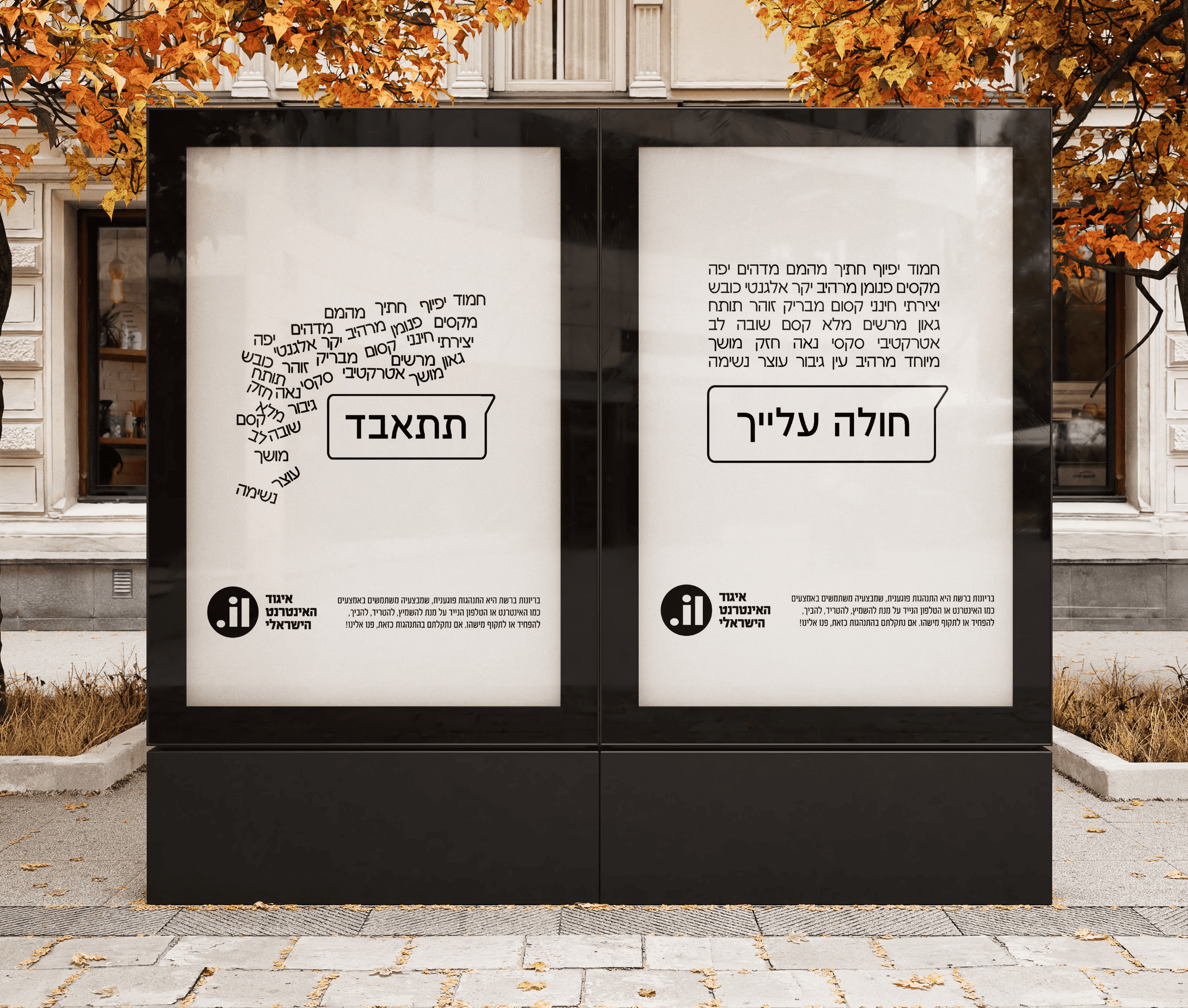 זוג כרזות לאיגוד האינטרנט הישראלי נגד בריונות ברשת, הפיצוח מציג בצורה טיפוגרפית איך הודעה אחת יכולה להרוס את כל המחמאות שקיבלת