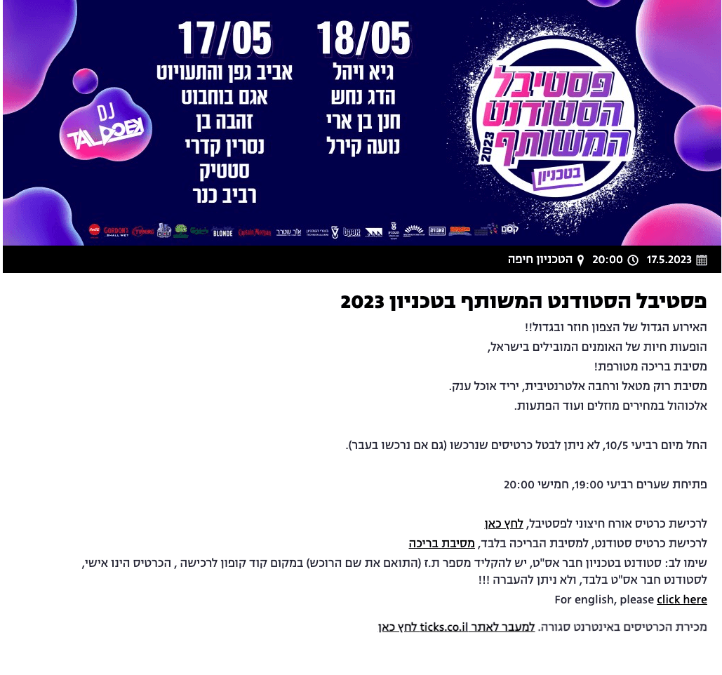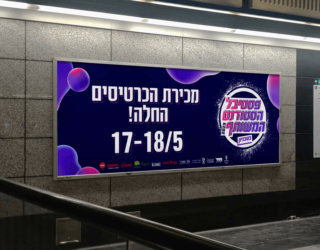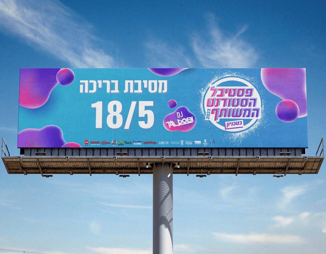 ב2023 הייתי חלק ממיתוג פסטיבל הסטודנט המשותף בטכניון, עיצבתי דברים ממותגים מקיפים לאירוע - שילוט, סושיאל, מיני סייטים, וכל דבר ממותג שנשא את לוגו הפסטיבל. בפסטיבל נכחו עשרות אלפי אנשים.